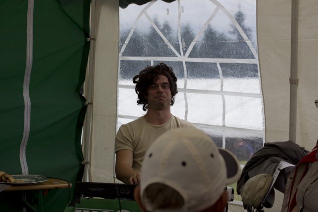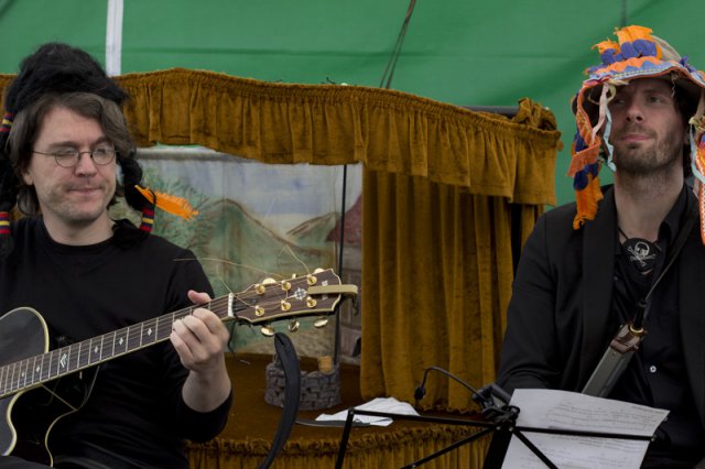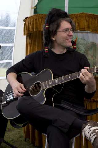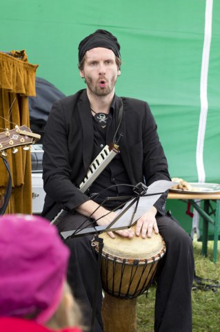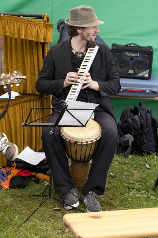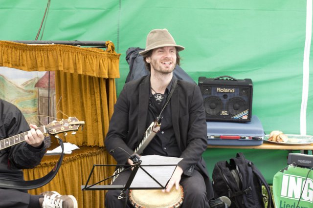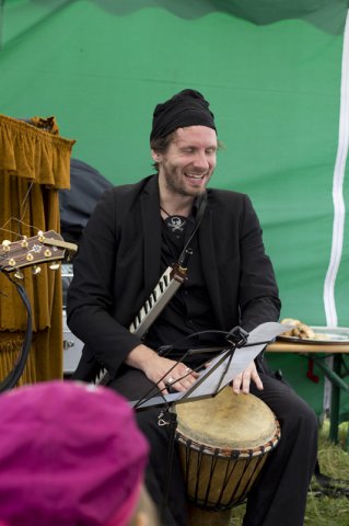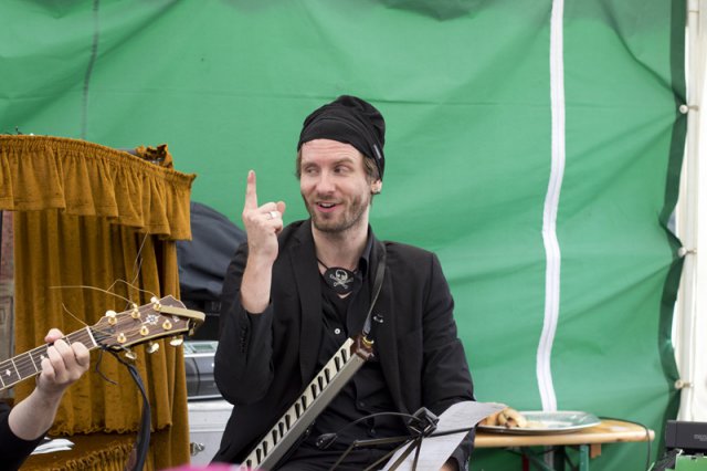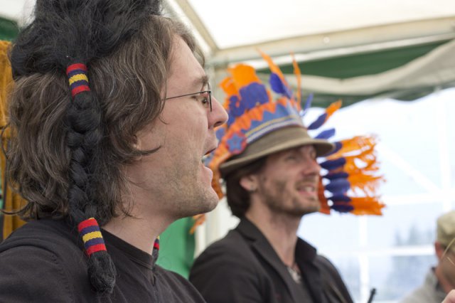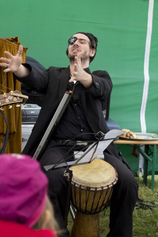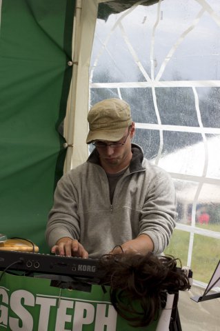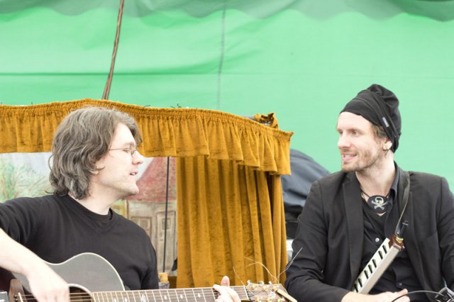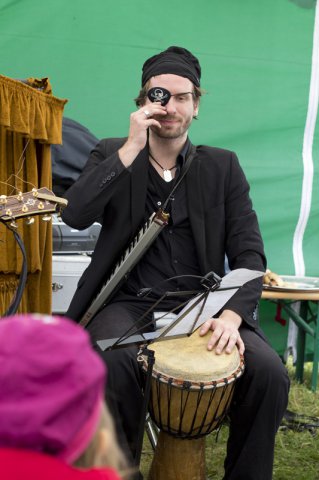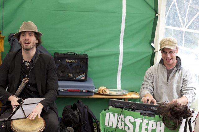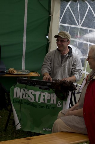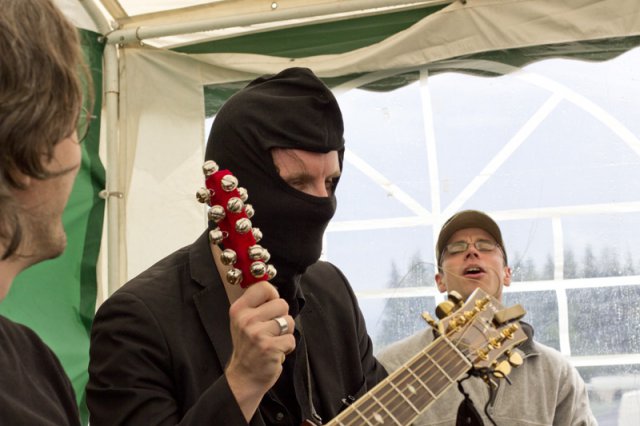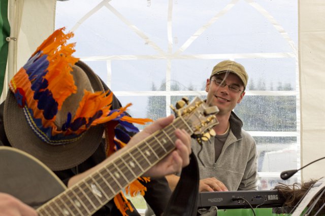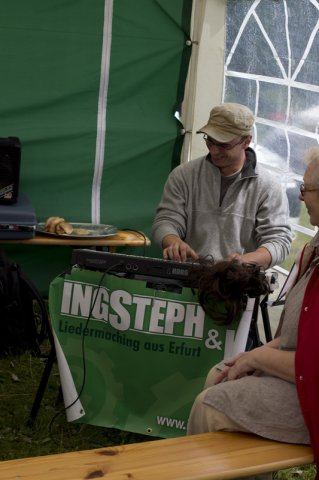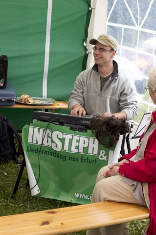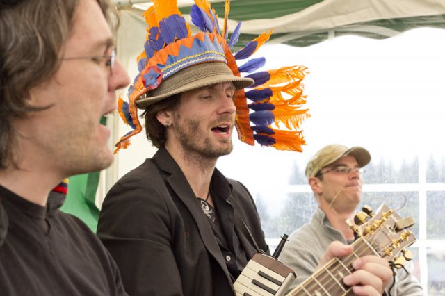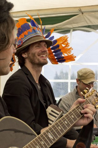Alte Schulfreunde von Stephan waren im Orgateam und haben trotz des Weltuntergangswetters ein Riesenfest auf die Beine gestellt. Es war stürmisch, nebelig und vor allem nass - Unsere Autos wühlten sich schmale Bergpässe nach oben und erbebten unter den Stockschlägen wütender Wanderer, die eine Durchfahrtgenehmigung nicht interessiert. Unsere Instrumente haben wir hunderte Meter durch den Regen geschleppt aber wir ließen uns es trotzdem nicht nehmen, eine Stunde im Kinderzelt Programm zu machen. Wir hatten zwar nur 4 Kinder im Publikum (der Rest waren aber gutgelaunte Erwachsene) und das Zelt wurde zwischenzeitlich fast weggeweht; denn plötzlich hob eine Bank hinter uns ab und der Verstärker flog nach vorn, überschlug sich und stand plötzlich perfekt ausgerichtet zwischen Stephan und Konrad - ABER: es war ein riesen Spaß und wir kommen gerne wieder, allein schon um unser neues "Pupslied" noch einmal zu performen... Hier gibt es noch ein paar Fotos: